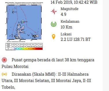 “#GempaMag:4.9, 14-Feb-19 10:42:42 WIB, Lok:2.20 LU, 128.71 BT (Pusat gempa berada di laut 38 km tenggara Pulau Morotai), kedalaman: 10 Km. Dirasakan (MMI) II-III Halmahera Utara, III Morotai Selatan, III Morotai Jaya, II-III Tobelo,” tulis @infoBMKG, akun twitter resmi BMKG, Rabu (13/2/2019).