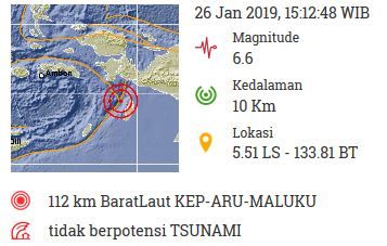 JAKARTA, iNews.id – Gempa bumi berkekuatan 6,6 skala richter (SR) yang mengguncang Kabupaten Kepulauan Aru, Provinsi Maluku, Sabtu (26/1/2019) pukul 15:12 WIB, menimbulkan kerusakan dua bangunan. Kendati demikian dipastikan tak ada korban dan situasi sudah kondusif.