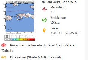 "Gempa Mag:2.7, 03-Okt-19 05:56:52 WIB, Lok:3.38 LS, 128.35 BT (Pusat gempa berada di darat 4 km Selatan Kairatu), Kedlmn:10 Km Dirasakan (MMI) II Kairatu,” tulis @infoBMKG, akun twitter resmi BMKG, Kamis (3/10/2019).