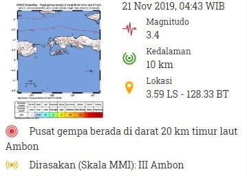 “#Gempa Mag:3.4, 21-Nov-19 04:43:28 WIB, Lok:3.59 LS, 128.33 BT (Pusat gempa berada di darat 20 km timur laut Ambon), Kedlmn:10 Km Dirasakan (MMI) III Ambon,” tulis @infoBMKG, akun Twitter resmi BMKG, Kamis (21/11/2019).