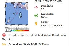 “Gempa Mag:5.1, 05-Okt-19 12:27:30 WIB, Lok:5.67 LS, 133.54 BT (Pusat gempa berada di laut 76 km Barat Dobo, Kep. Aru), Kedlmn:10 Km Dirasakan (MMI) IV Dobo,” tulis @infoBMKG, akun twitter resmi BMKG, Sabtu (5/10/2019).