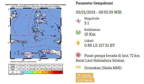 “Gempa Mag:5.1, 05-Jan-19 08:55:39 WIB, Lok:0.89 LS,127.51 BT (72 km Barat Laut HALMAHERASELATAN-MALUT), Kedalaman:10 Km. Tidak berpotensi tsunami,” tulis BMKG di akun resmi Twitter-nya, Sabtu (5/1/2019).