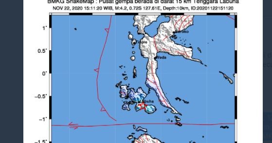 “#Gempa Mag:4.2, 22-Nov-20 15:11:20 WIB, Lok:0.72 LS, 127.61 BT (Pusat gempa berada di darat 15 km Tenggara Labuha), Kedlmn:10 Km,” tulis @infoBMKG.