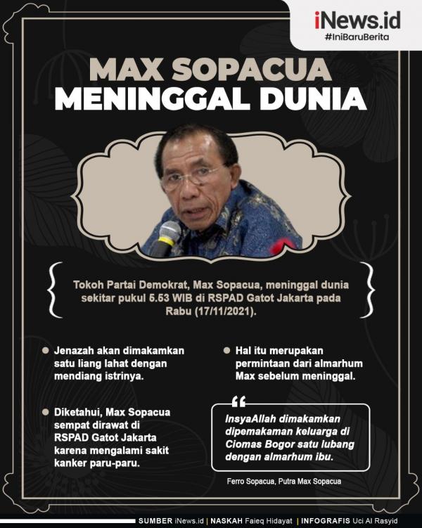 Diketahui, Max Sopacua sempat dirawat di RSPAD Gatot Jakarta. Dia dirawat tiga pekan karena sakit kanker paru. "Indikasinya kanker di paru-paru meninggal tadi pagi jam 5.53 WIB di RSPAD," katanya.