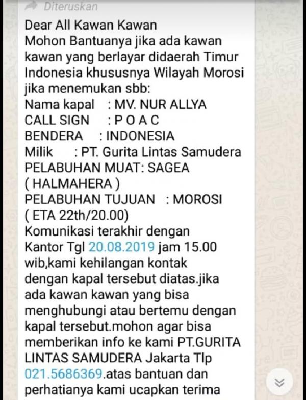 Dalam pesan tersebut, pihak perusahaan juga meminta bila ada yang berlayar di perairan Timur Indonesia, khususnya wilayah Morosi, Kabupaten Konawe, Sulawesi Tenggara (Sultra), melihat kapal tersebut, segera menghubungi pihak kantor.